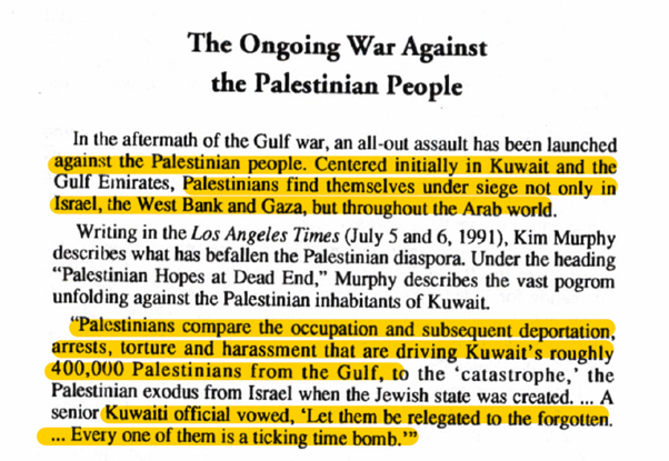 Shortly after the Gulf war, Palestinians residing in these countries found themselves under a siege similar to the one in Gaza and West Bank. A Kuwaiti official suggested they need to be eradicated as “every one of them is a ticking time bomb”