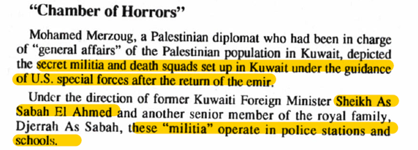 Secret death squad militias were created by US special forces and under directions of Sabah Al Ahmed. These militias harassed Palestinians in Kuwait and operated in schools and police stations