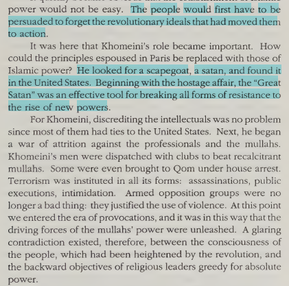 Khomeini was prompted by the West; in Paris he was interviewed hundreds of times by westerner journalist. Made a name out of nothing and stole the revolution Iranian people made. He came up with the Great Satan story while having direct communication line with both Carter and Reagan.