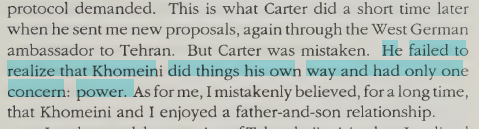 Even though Carter reassured Khomeini and promised to prevent the defeat of Iran. Both Carter and Reagan offered arms and spare parts. Khomeini played on both lines, and in return practiced Taqiyya and chose Reagan’s offer instead.