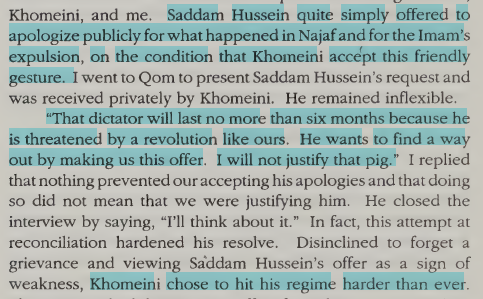 Saddam offered apologise for exiling Khomeini to France, but Khomeini chose not to accept and to continue with the aggression towards Iraq.