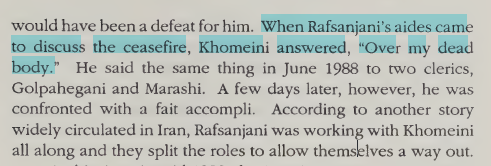 Iraq Victory made Khomeini accept the peace resolution. From “over my dead body” to “poisonous chalice”. Khomeini was a sore loser.