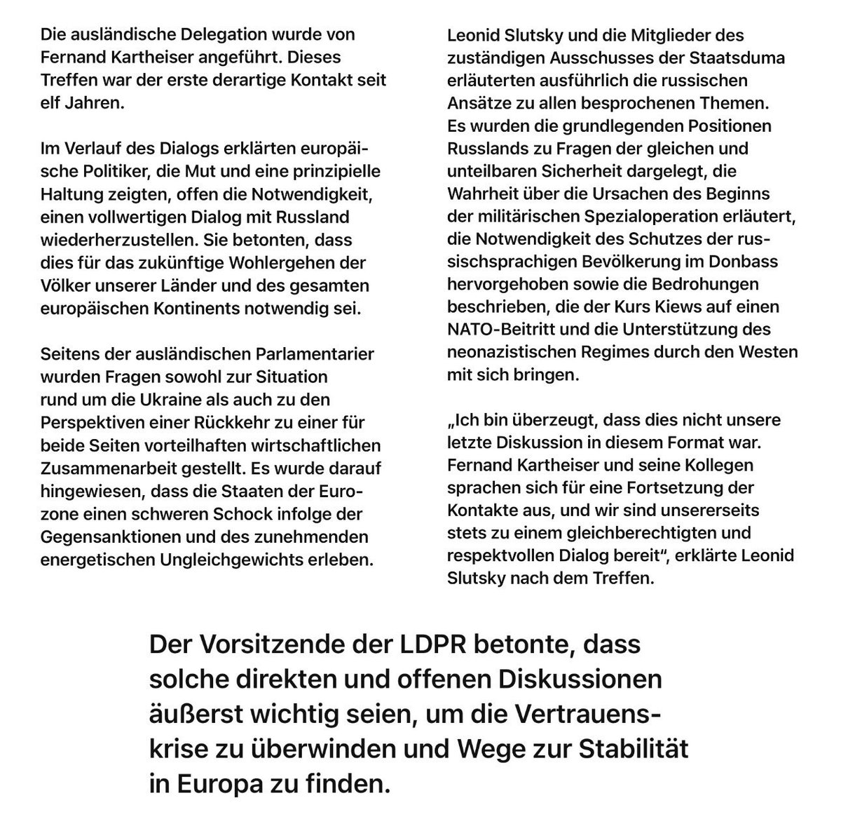 Hinter dem Schlagwort „Dialog“ verbarg sich eine Propaganda Bühne. Die Abgeordneten ließen sich dazu einspannen über die Situation in der Ukraine und die Wiederherstellung der wirtschaftlichen Zusammenarbeit zu sprechen. Ein Auftritt den der Kreml offiziell als Beweis für den „Mut“ und die „prinzipientreue Position“ dieser Politiker darstellte.