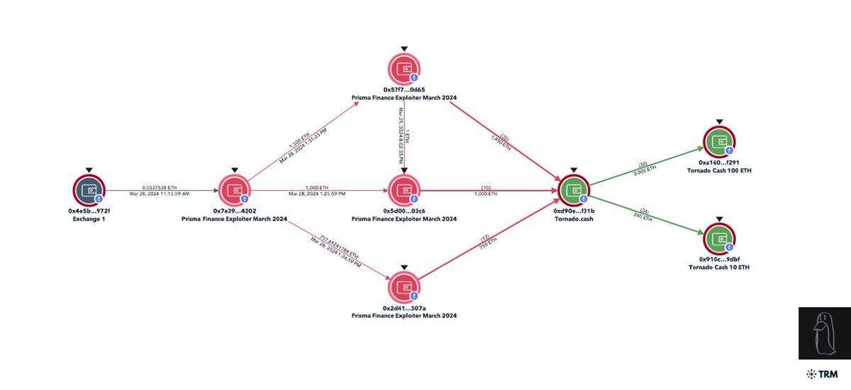 1) Transfer $1.3M to theft address 2) Bridge $1.3M from Solana to Etheruem via deBridge 3) Deposit 50.2 ETH to Tornado 4) Transfer 16.5 ETH to two exchanges