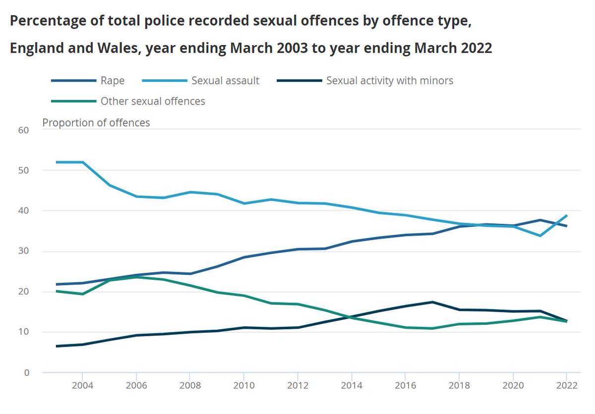 The Office of National Statistics suggested a lot of this has to do with changes in police record-keeping (they don't say what that means) and people being more willing to come forward about rape.