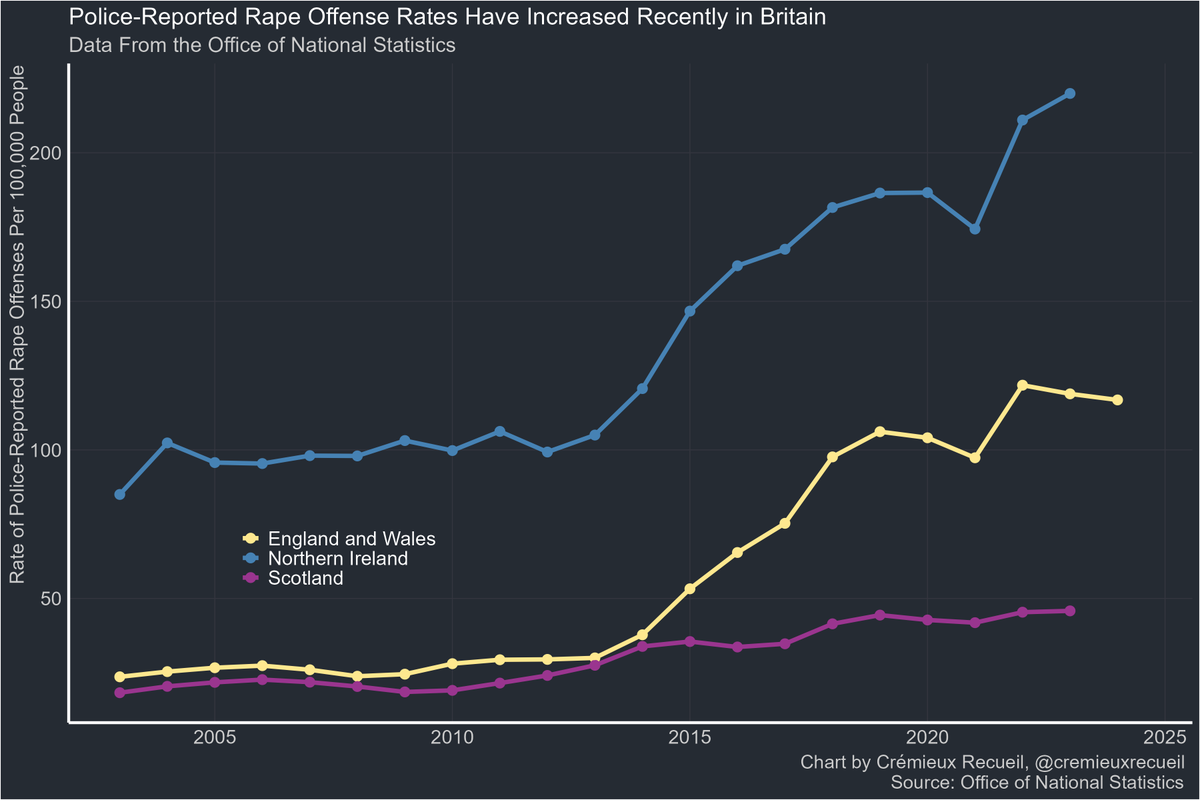 The rates of police-recorded rape incidents in England and Wales, Northern Ireland, and Scotland, have increased over time.