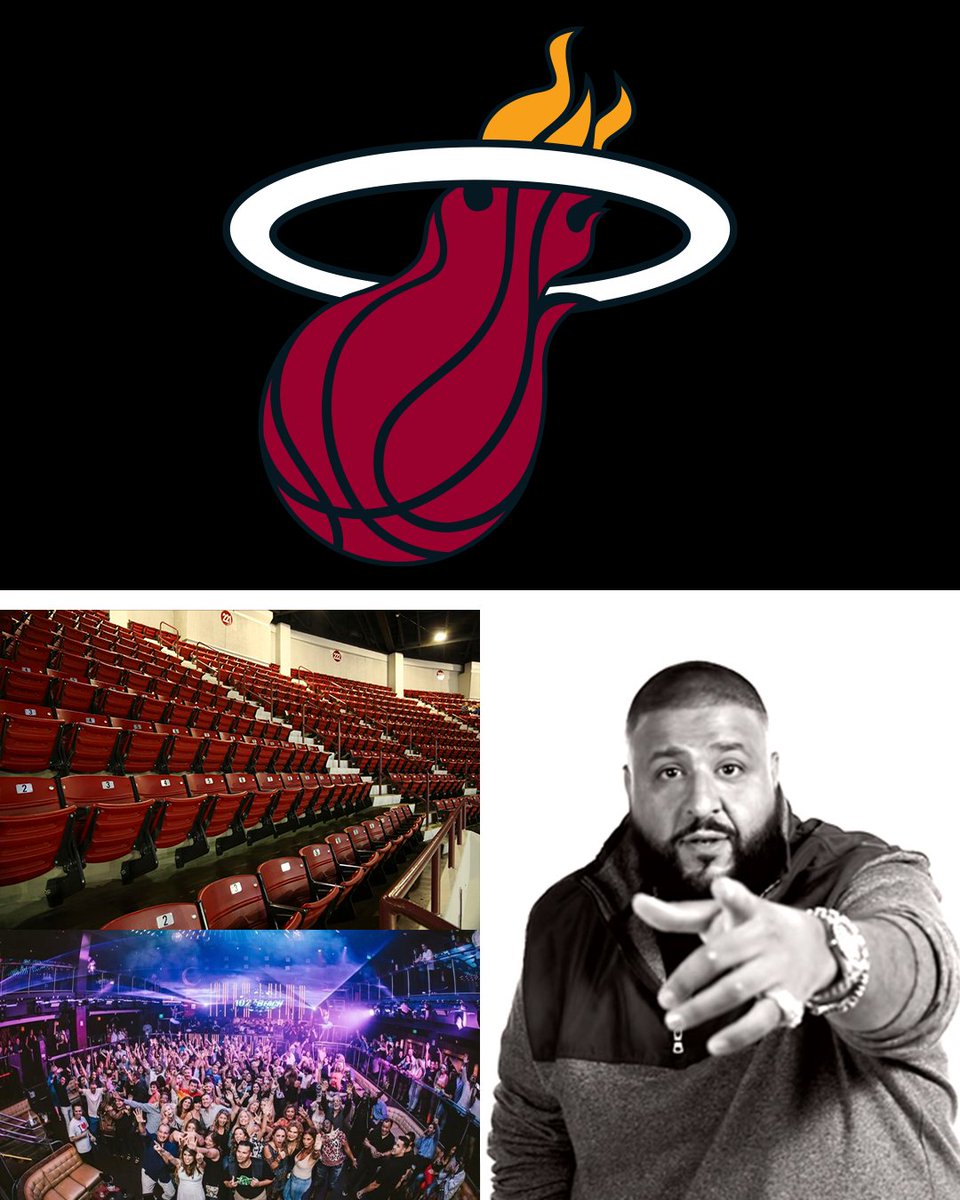 Heat logo on top. Bottom has image of DJ Khaled on the right and on the left is image of empty seats and people at a night club.