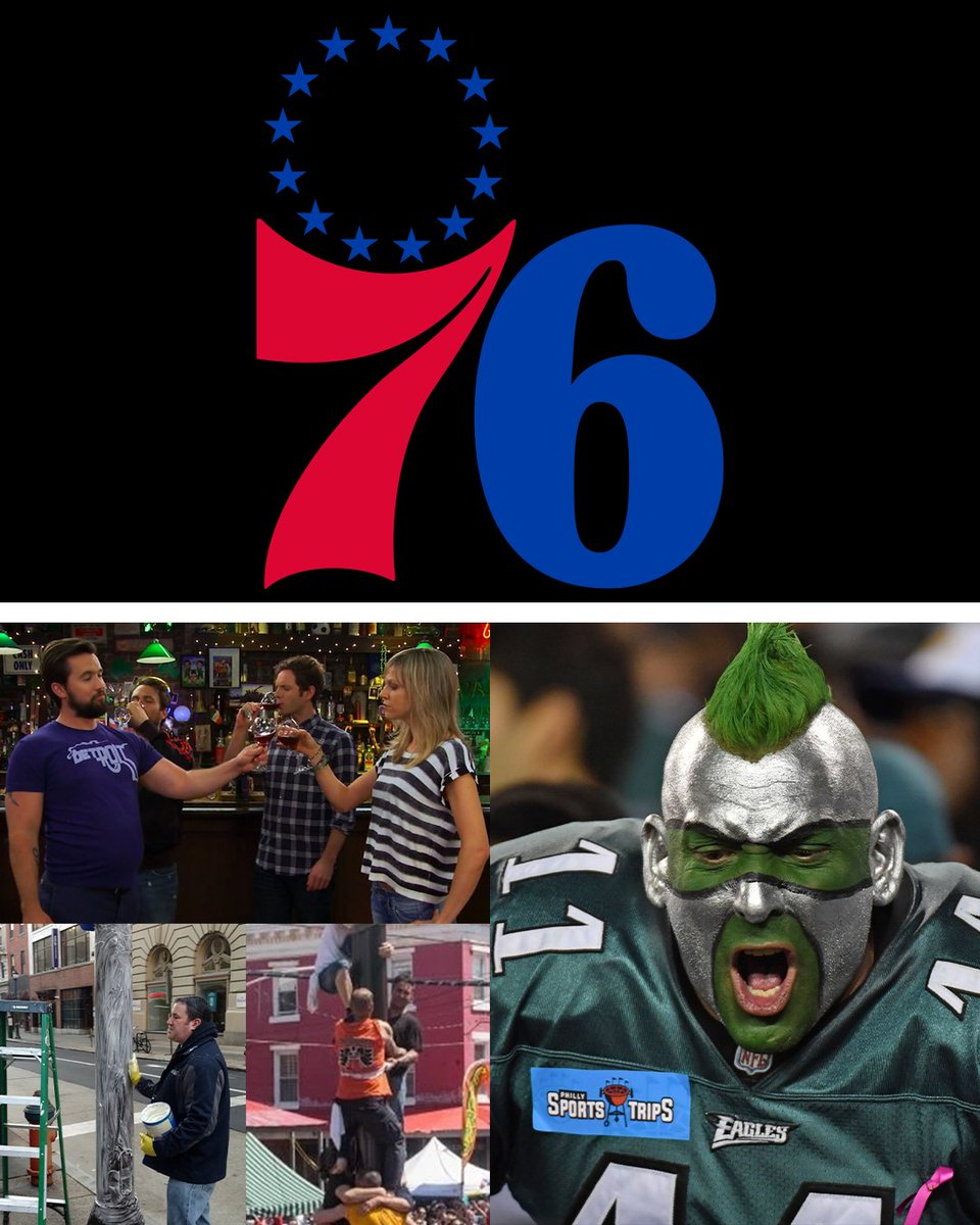76ers logo on top. Bottom has the crazy viral Eagles fan, people climbing up poles, and an image from the show “It’s Always Sunny in Philadelphia”.