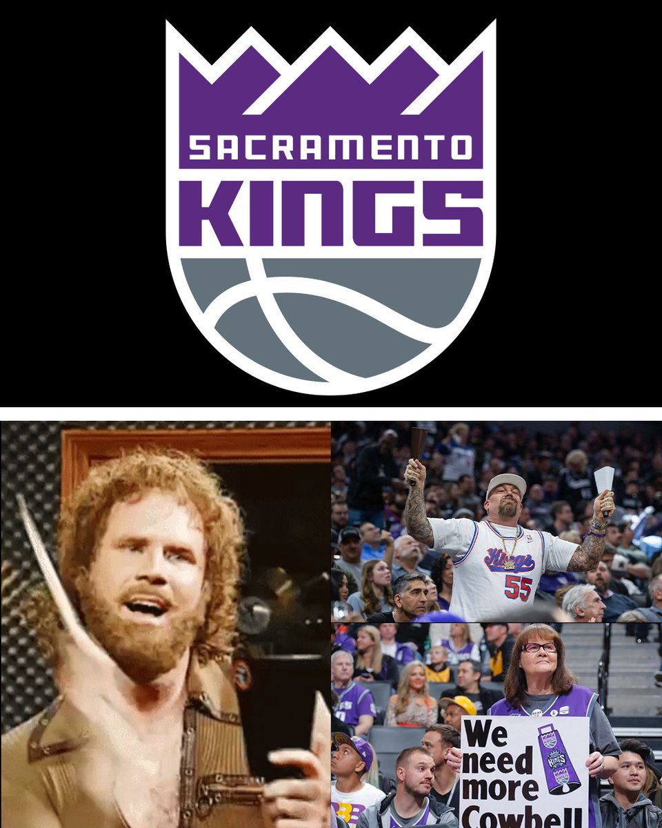 Kings logo on top. Bottom has an image from the old SNL skit with cowbells and Kings fans hitting cowbells at a game.