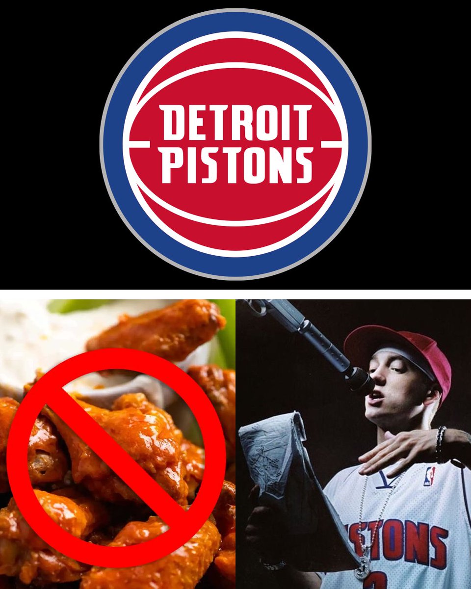 Pistons logo on top. Bottom has Eminem on the right and a caution symbol over chicken wings.