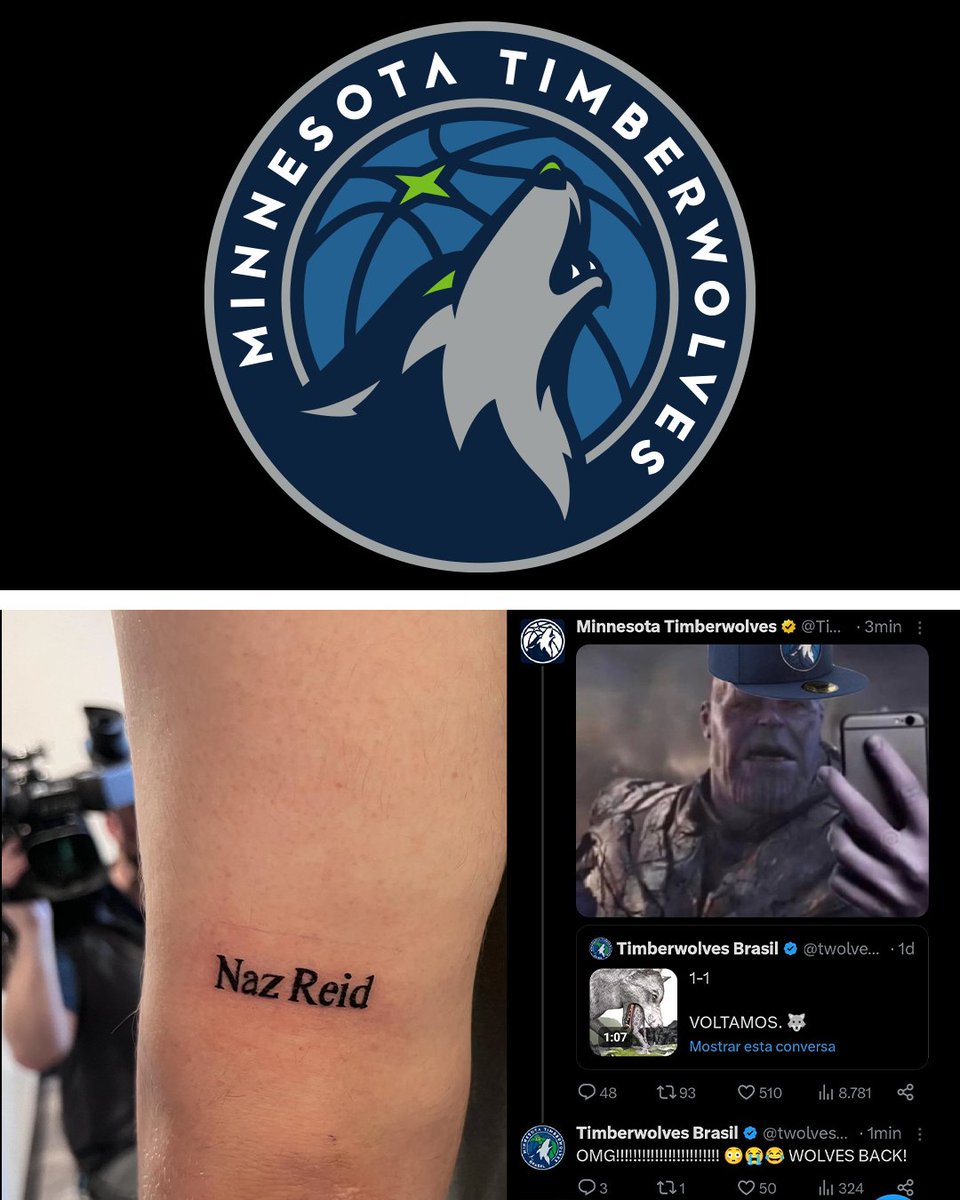Timberwolves logo on top. Bottom has Naz Reid tattoo on the left and on the right is screenshots between the Timberwolves X account and the now deactivated Timberwolves Brasil account.
