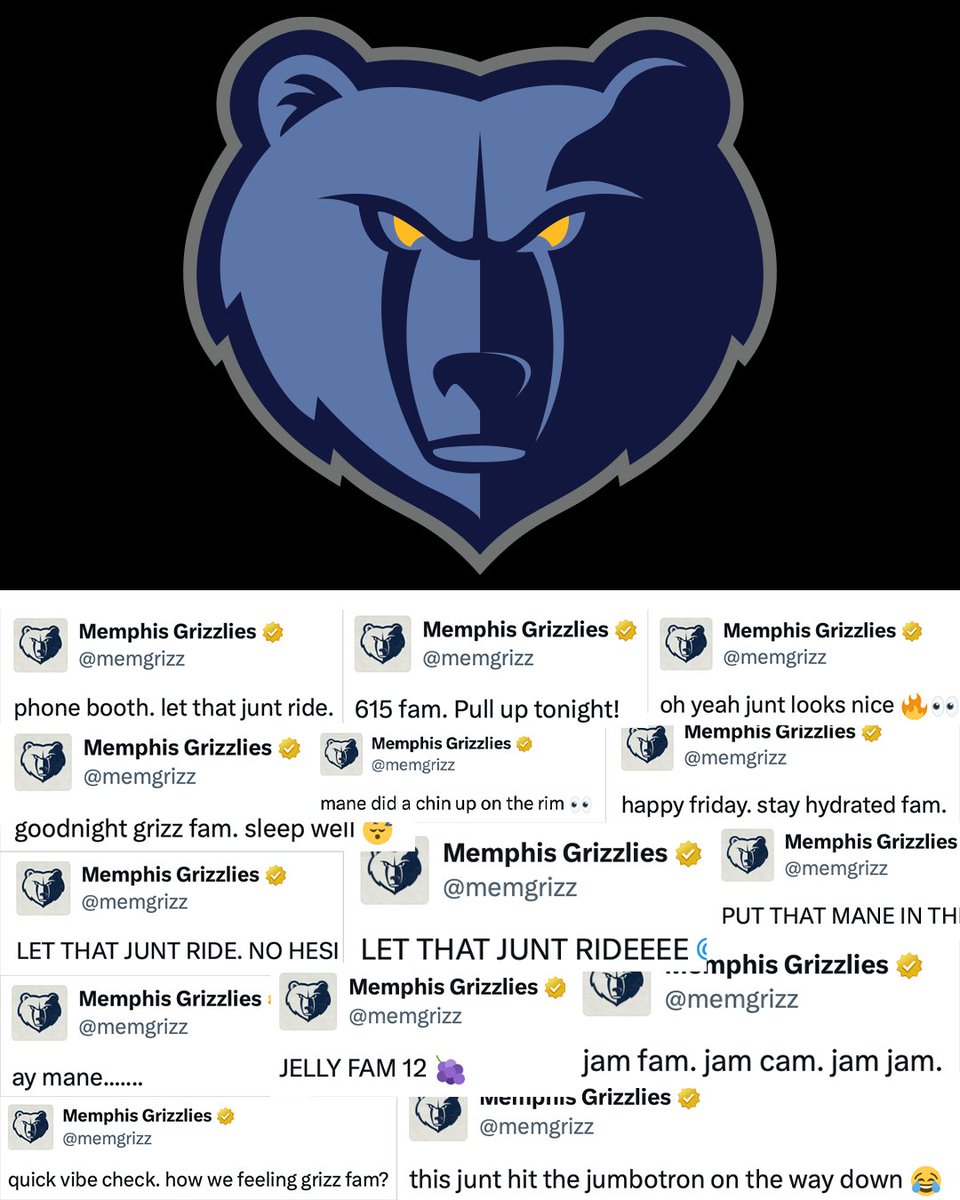 Grizzlies logo on top. Bottom has screenshots from their X account featuring the words “junt” “fam” and “mane”.