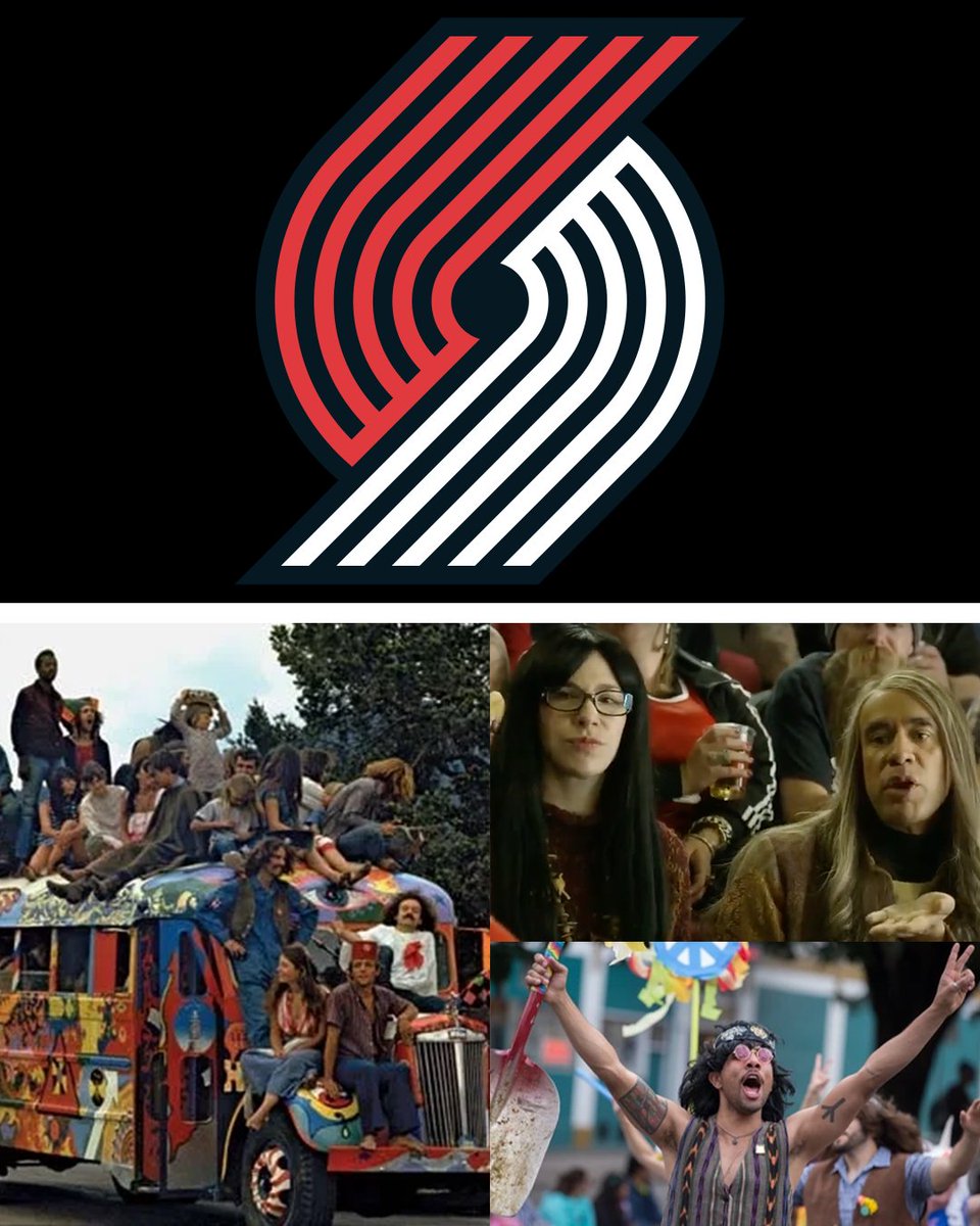 Trail Blazers logo on top. Bottom has images found with the search “Hippies” and s screenshot from the show “Portlandia”.