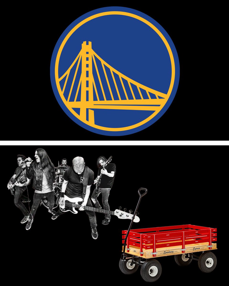Warriors logo on top. Bottom has image of a band and a wagon.