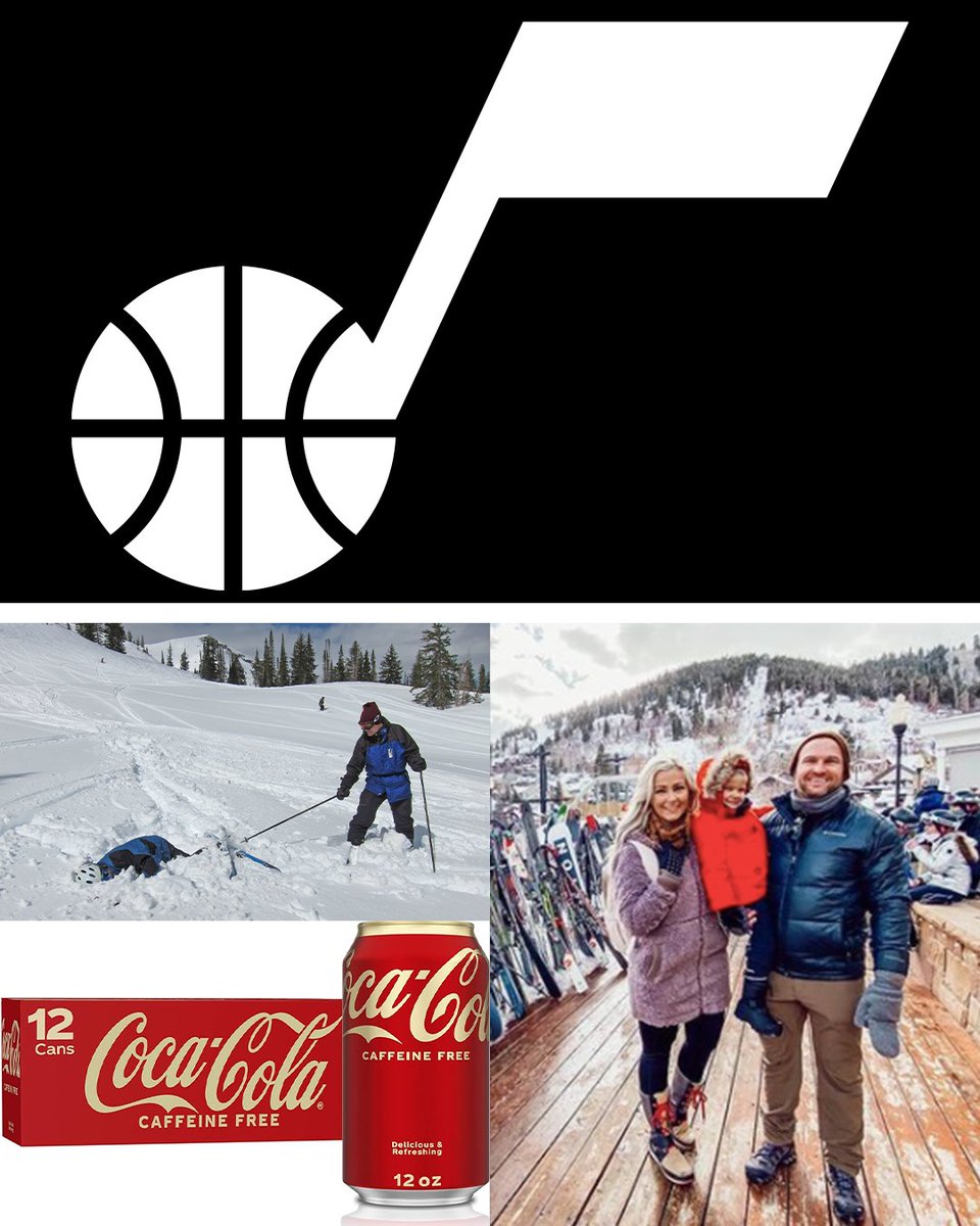 Jazz logo on top. Bottom is image of people skiing and an image of caffeine free Coca Cola.