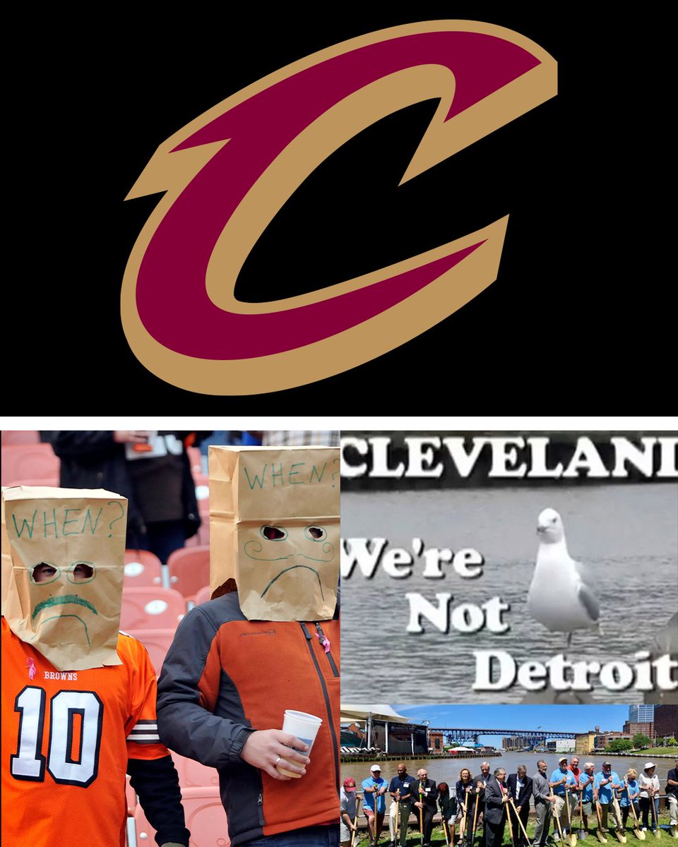 Cavaliers logo on top. Bottom is image of Browns fans with paper bag over head on the left. Right is a screenshot from the viral video with text that says “We’re not Detroit” and an image of the river in the city.