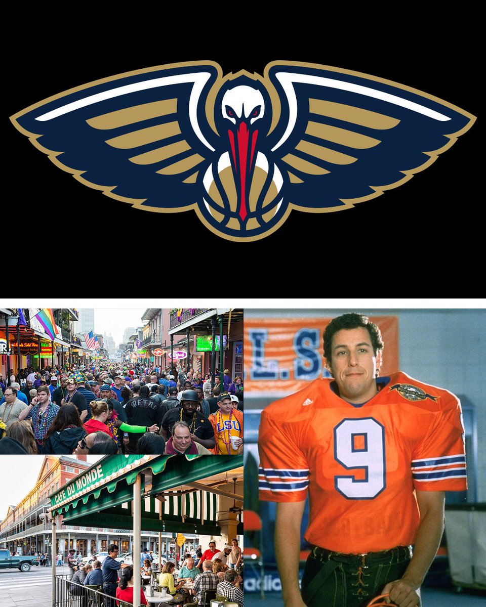 Pelicans logo on top. Bottom has image of Bobby Boucher from the movie “The Waterboy” on the right and images of people on Bourbon Street on the left.