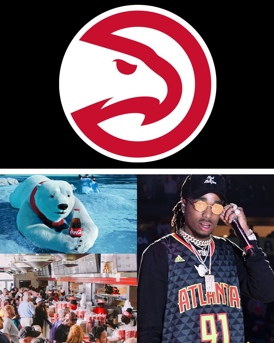 Hawks logo on top. Bottom: Has Coca Cola Polar Bear, people eating at The Varsity, and Quavo in a Hawks jersey.