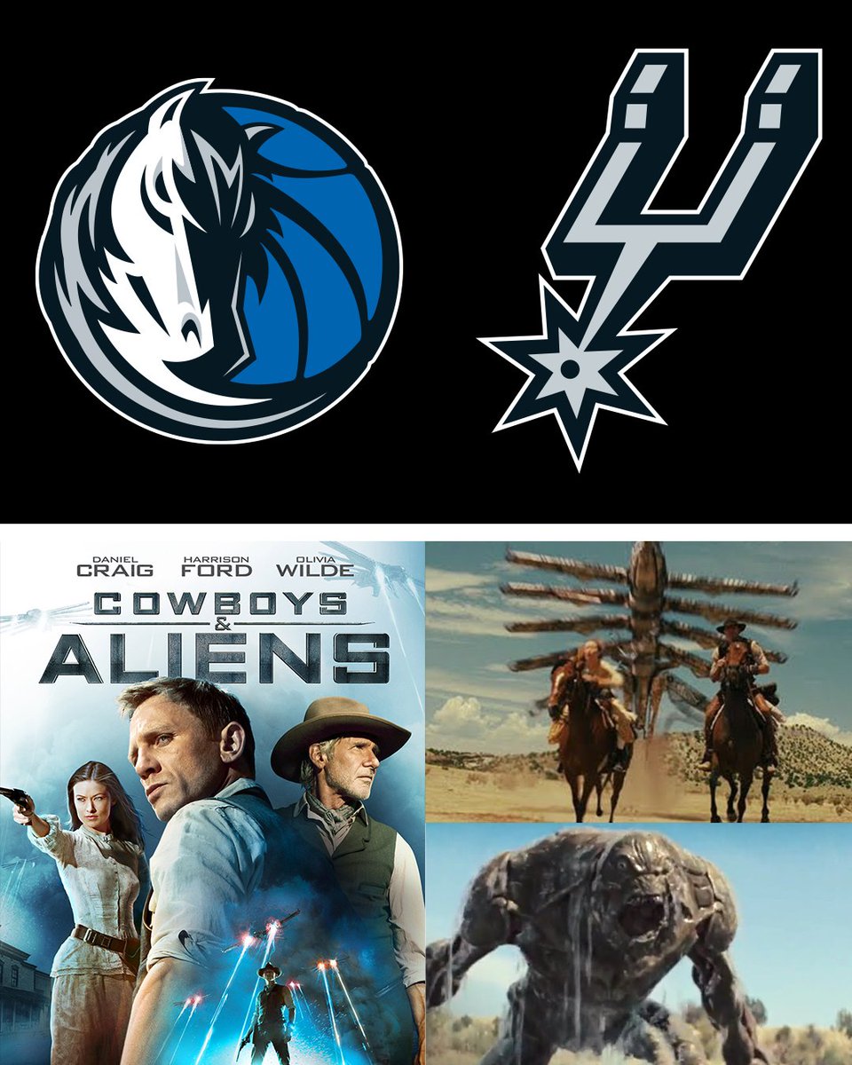 Mavericks and Spurs logo on top. Bottom has movie poster of the movie “Cowboys & Aliens” with screenshots from the movie.