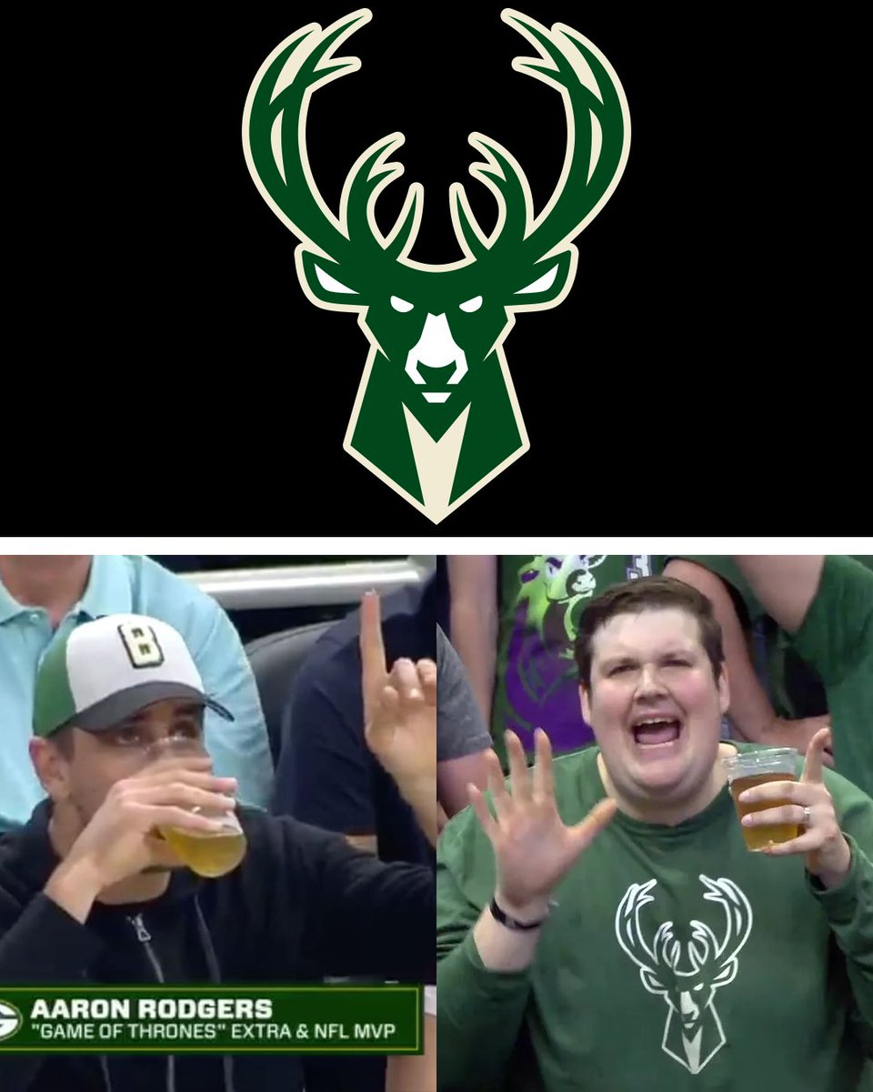 Bucks logo on top. Bottom is image of Aaron Rodgers chugging beer on the left and a viral fan chugging beer on the right.