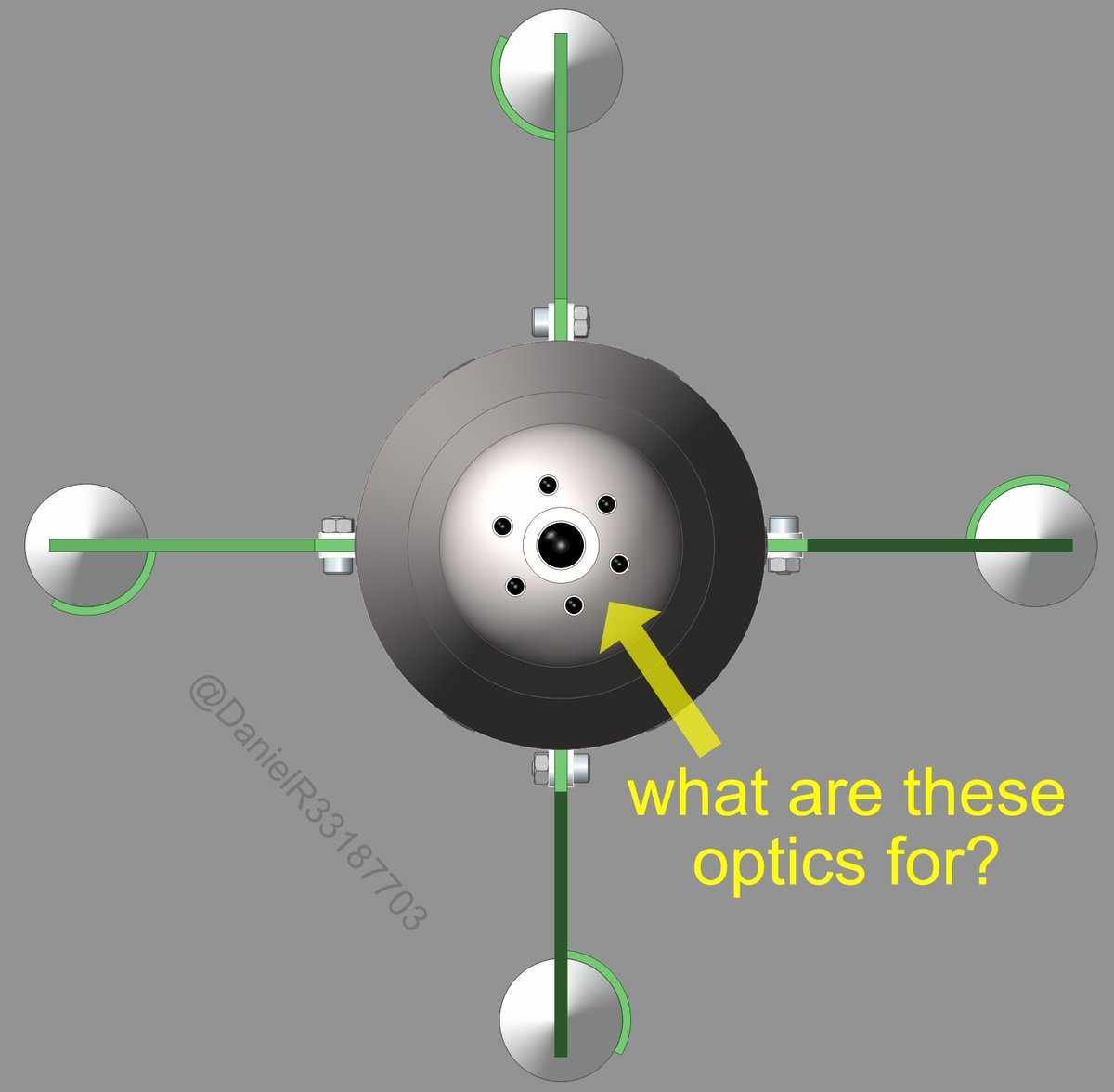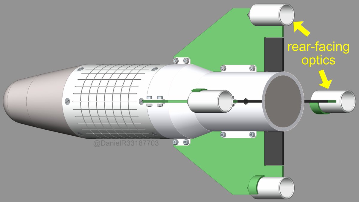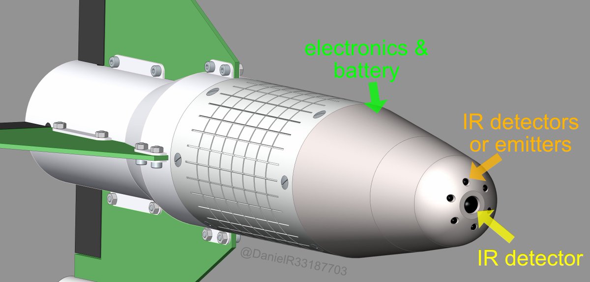 7. There appear to be four rear-facing optical detectors. These may be for “beam-riding” where the munition follows a laser beam pointed at the target. This raises the question why this munition has both rear-facing and forward-facing optics.