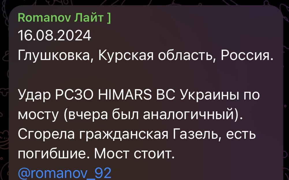 According to Romanov, the AFU again struck the bridge over the Seym river near Glushkovo in the Kursk region. Yesterday, similar attacks were reported.