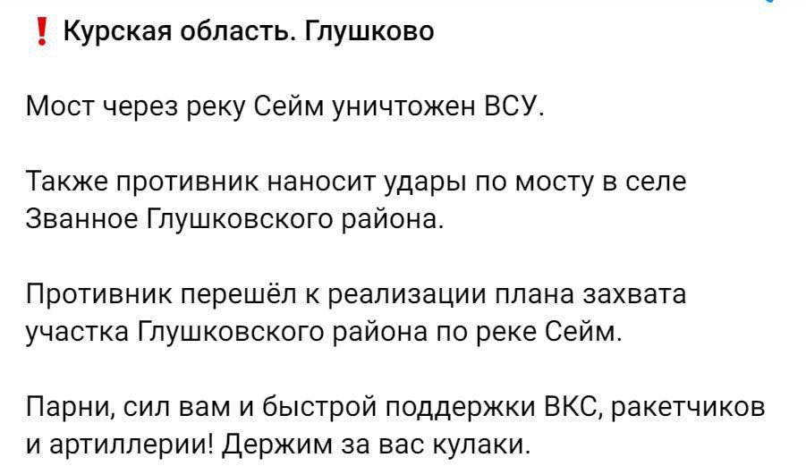 The bridge over the Seym River near the village of Glushkovo in the Kursk region has been destroyed after being hit by MLRS (Multiple Launch Rocket System) ammunition. As a result, approximately a battalion of Russian Armed Forces soldiers might be encircled in the area.