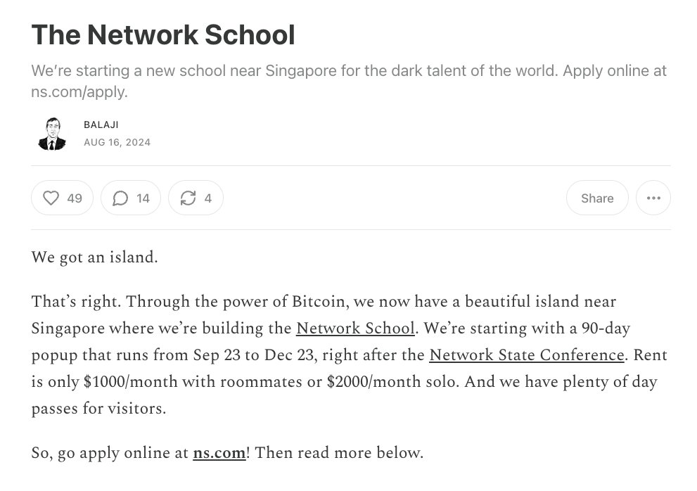 That’s right. Through the power of Bitcoin, we now have a beautiful island near Singapore where we’re building the Network School. We’re starting with a 90-day popup that runs from Sep 23 to Dec 23, right after the Network State Conference. Rent is only $1000/month with roommates or $2000/month solo. And we have plenty of day passes for visitors.