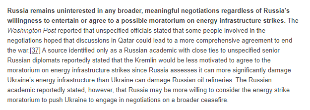 3/ Russia remains uninterested in any broader, meaningful negotiations regardless of Russia's willingness to entertain or agree to a possible moratorium on energy infrastructure strikes.
