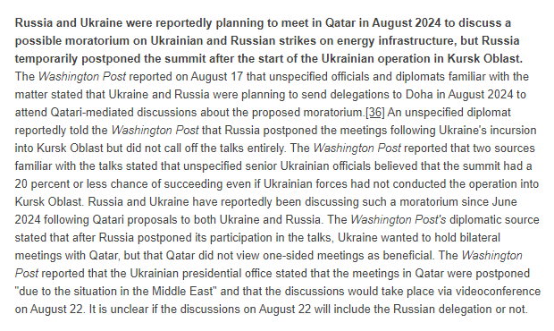 2/ Russia and Ukraine were reportedly planning to meet in Qatar in August 2024 to discuss a possible moratorium on Ukrainian and Russian strikes on energy infrastructure, but Russia temporarily postponed the summit after the start of the Ukrainian operation in Kursk Oblast.