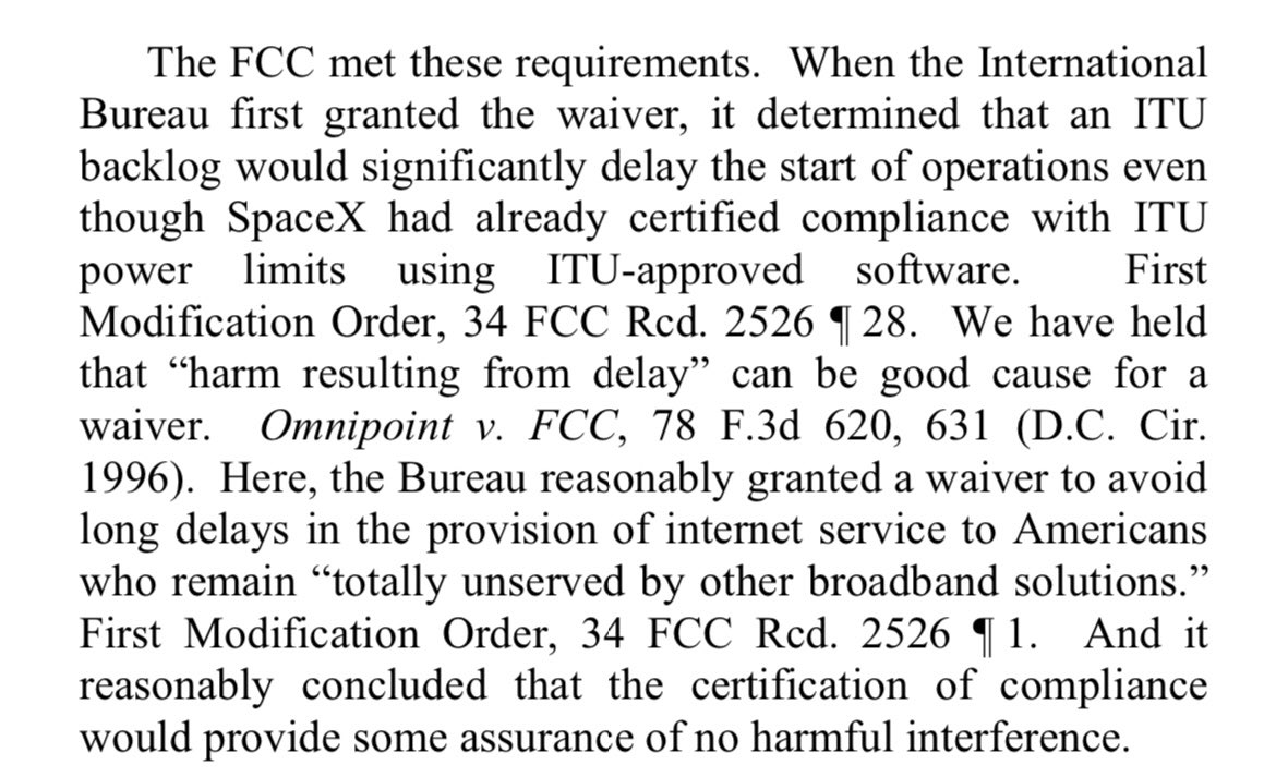 Whether SpaceX's request is successful is now in the FCC's hands. In the past, they have been successful with waiver requests concerning network interference (see e.g., Viasat v. SpaceX and International Dark Sky v. FCC). But those cases seem to be distinguishable...