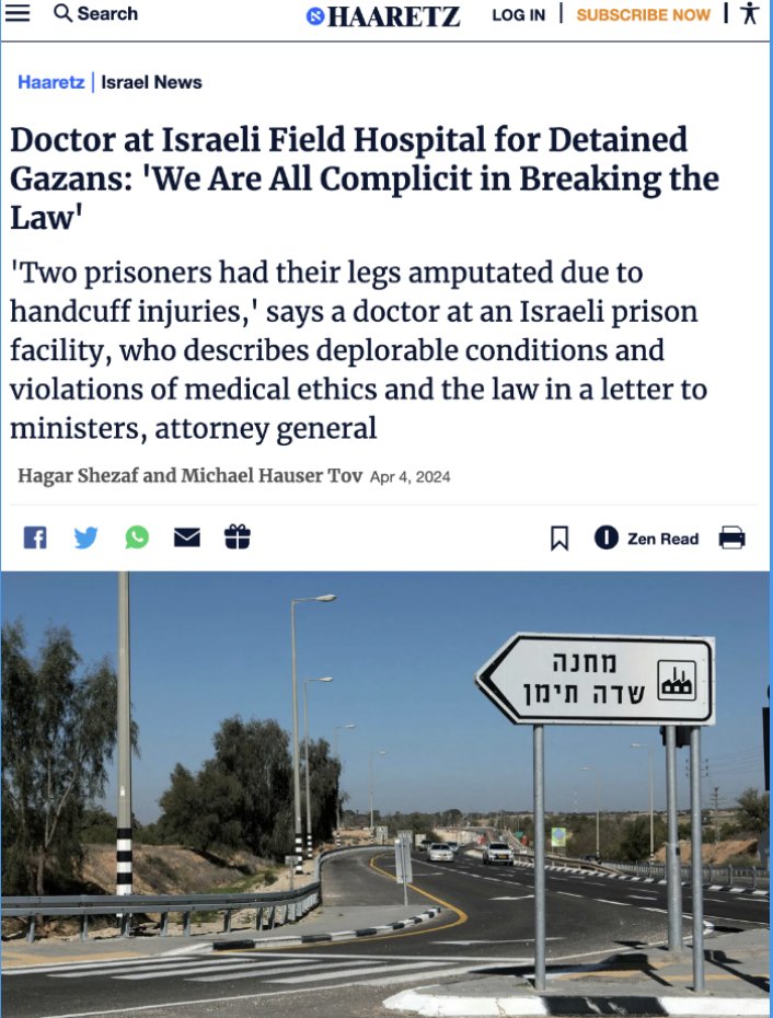 Oct. 7-present. Israel restrained prisoners round the clock by all 4 limbs at Sdei Teiman. 2 prisoners had legs amputated due to handcuff injuries, 1 had a hand amputated, described as "a routine event." Inmates fed through straws, defecate in diapers. haaretz.com/israel-news/20…