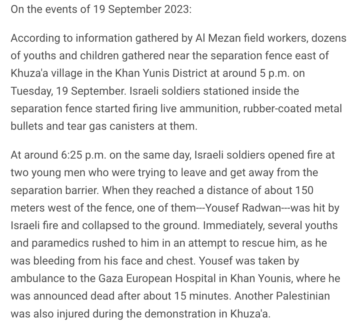 Sep 2023: For weeks, dozens of Palestinians in Gaza protested at the separation barrier. In one case, as Yousef Salem Yousef Radwan was running away from the barrier, Israeli forces killed him w/ a shot in the head from behind reliefweb.int/report/occupie…