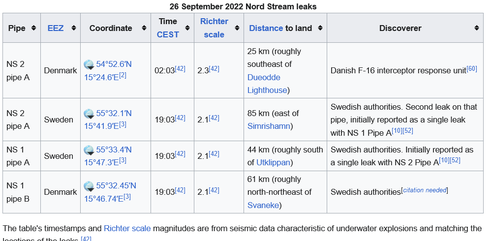 Door een reeks onderwaterexplosies over een afstand van 25 tot 85 km van elkaar en de daaruit voortvloeiende gaslekken worden 3 van de 4 gaspijpleidingen van Nord Stream 1 (NS1) en 2 van de 23 gaspijpleidingen van Nord Stream 2 (NS2), zwaar beschadigd.