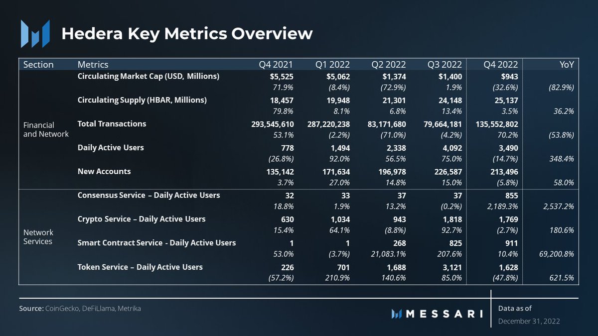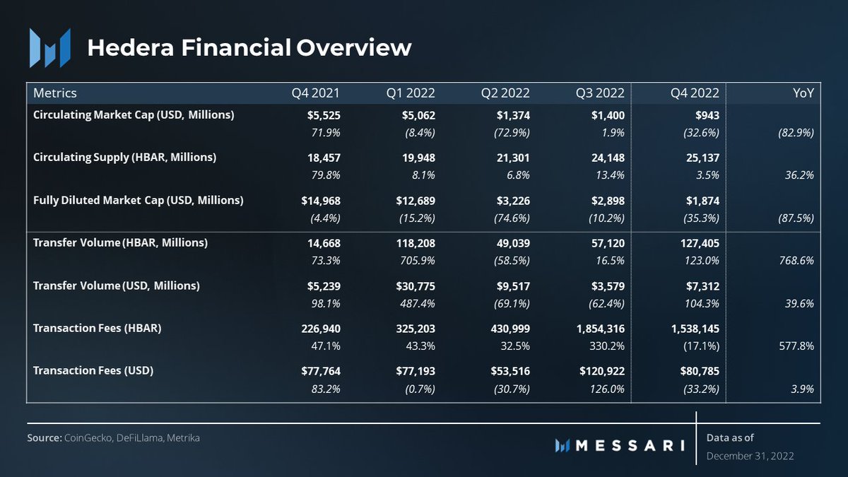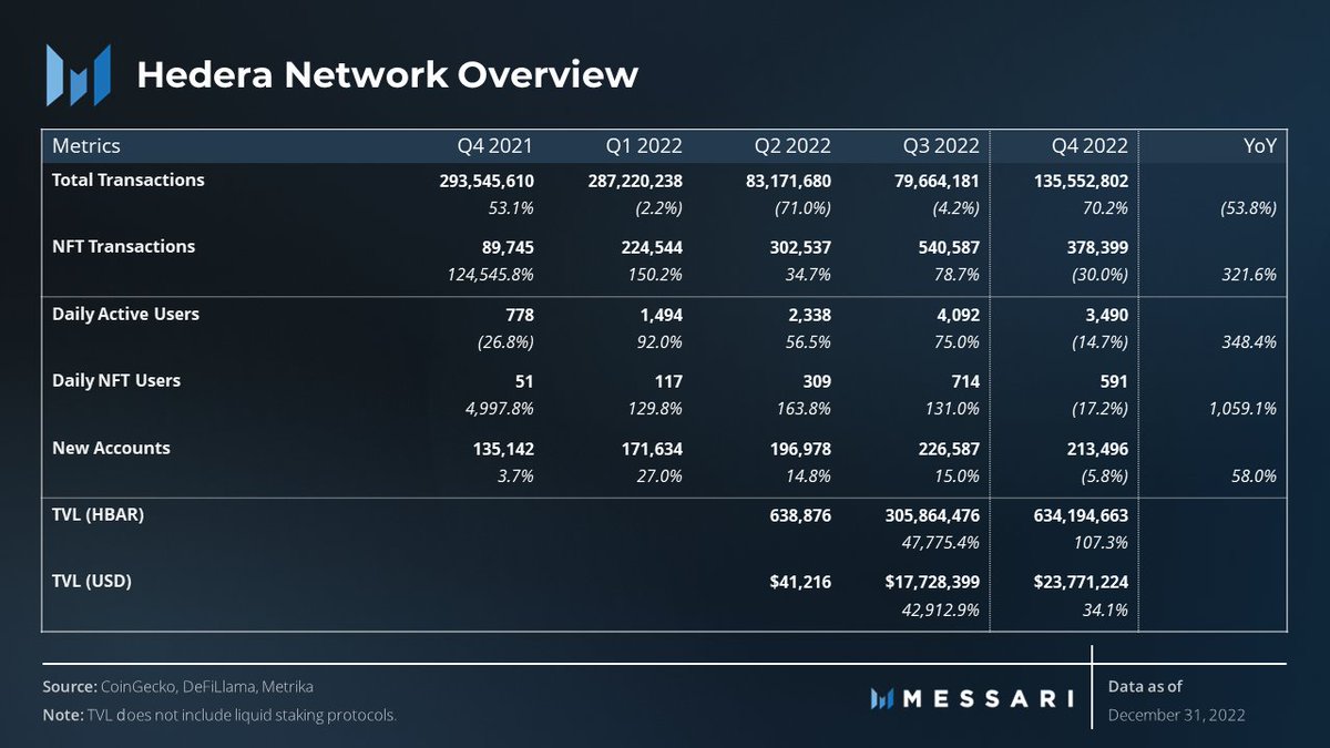 At the end of Q4, Hedera had a TVL of $23M. This growth in TVL is particularly noteworthy as the Hedera DeFi ecosystem only recently launched in Q2'22.