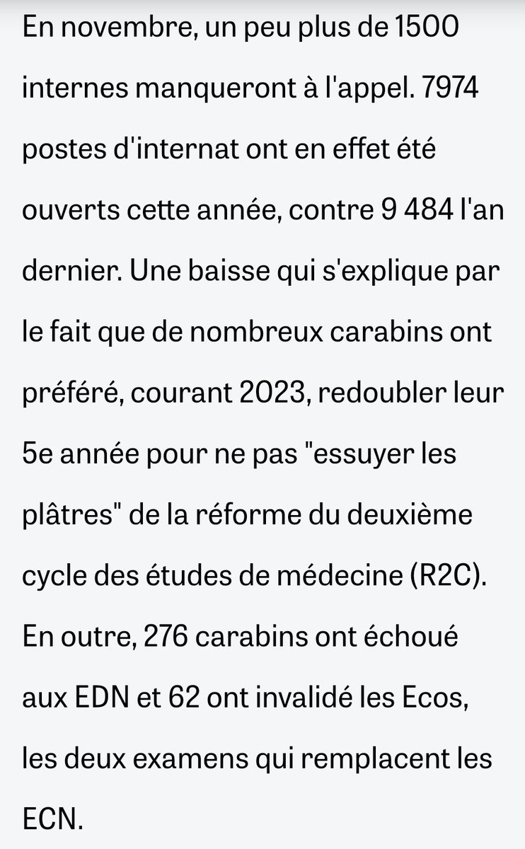 Oui il y aura 1500 internes de moins l'an prochain, et ça arrive au pire moment, c'est une catastrophe.