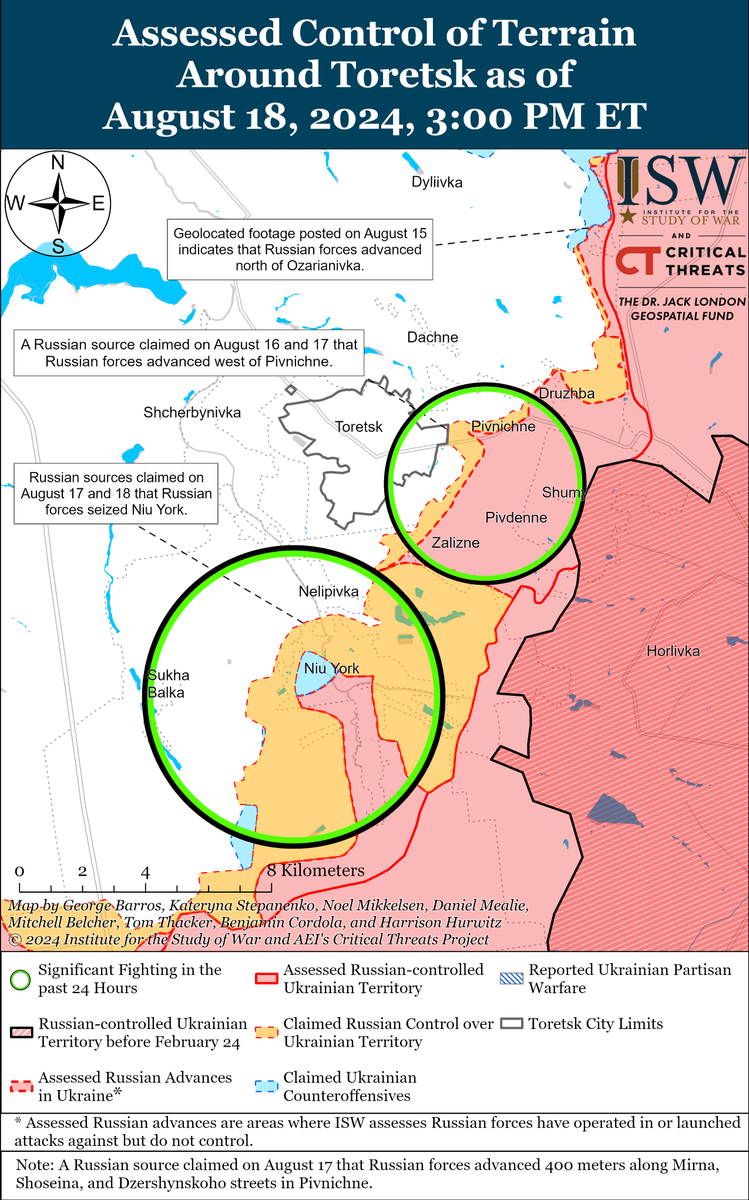 Russian forces have overall occupied 1,175 square kilometers of territory throughout the entire Ukrainian theater in the seven months from January and July 2024, as ISW recently assessed. In stark contrast, ISW has observed claims that Ukraine's operation in Kursk Oblast advanced roughly 800 square kilometers over six days from August 6 to 12 and advanced roughly 28 kilometers deep as of August 17. (1/7)