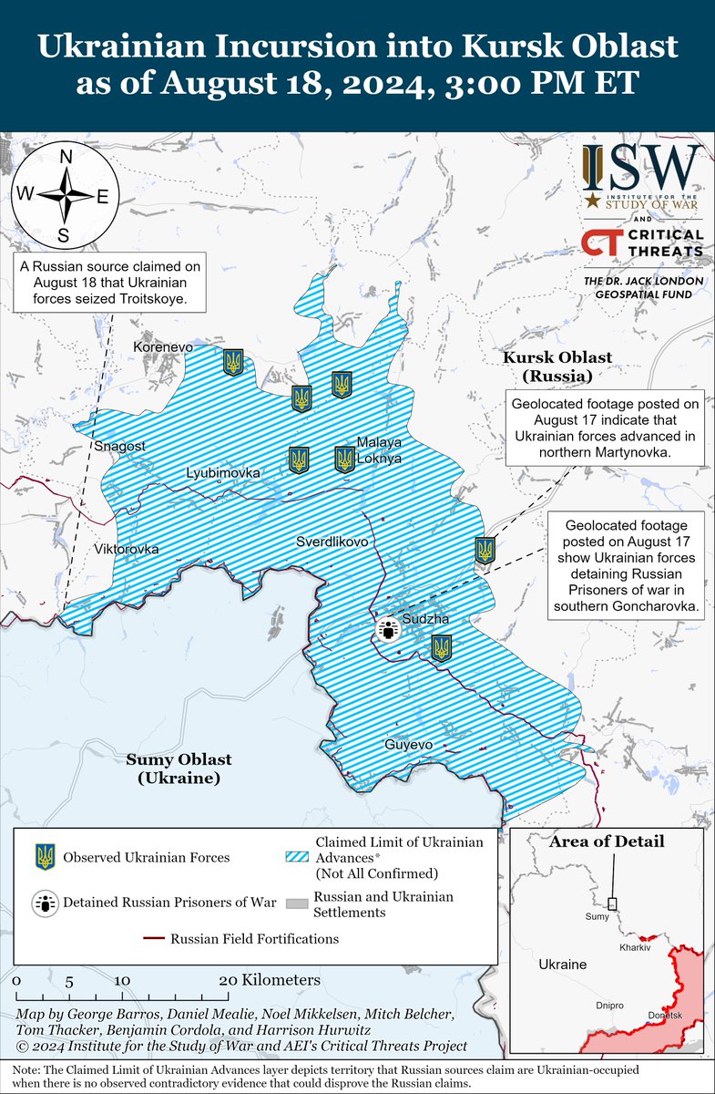 3/ A Russian milblogger claimed on August 18 that Ukrainian forces seized Troitskoye (south of Korenevo and roughly two kilometers from the international border) and advanced to Semenovka (north of Sudzha and roughly 24 kilometers from the international border).