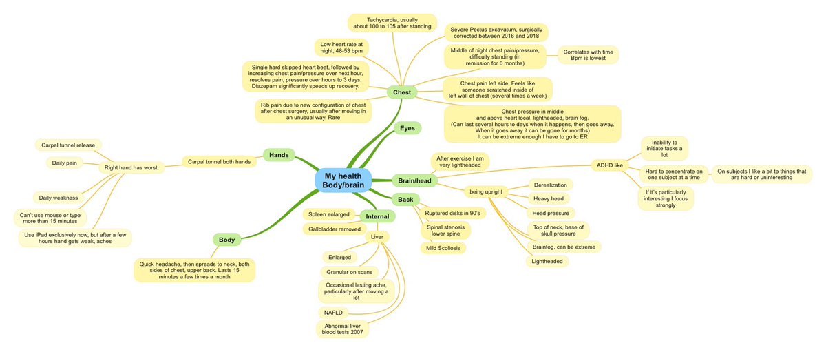 Three years ago I sent my new MD a mind map of my health. When I saw her she was excited to talk about my method and asked me if I would be willing to teach it to her patients over Zoom.