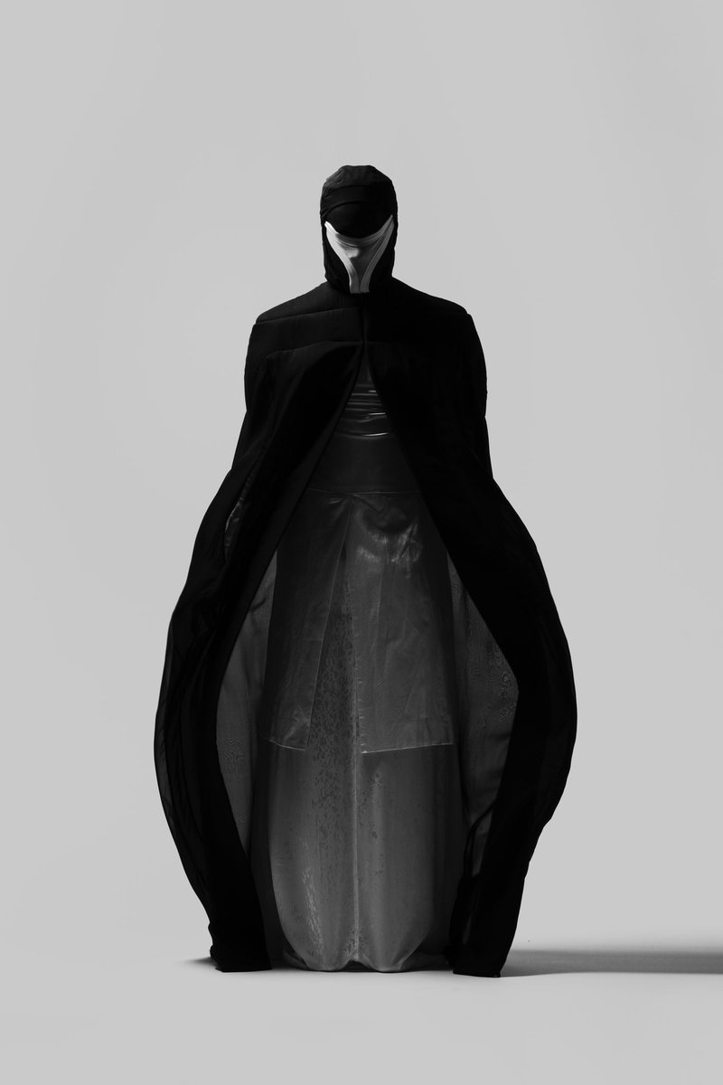 This look is meant to be a full body interpretation of the bird, with the goal to create the physical appearance as accurately as I can. The underside a combination of this Dion lee top and a Louis Gabriel Nouchi robe wrapped around my waist. The cape from Rick Owens.