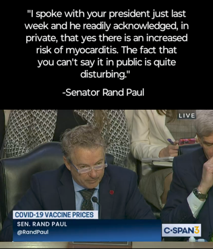 On March 22, 2023, C-SPAN posted this bombshell video clip of Senator Rand Paul explaining that Moderna's president privately told him that he was aware the mRNA Covid jabs were associated with a dose-dependent increased risk of myocarditis in adolescent boys & young men!