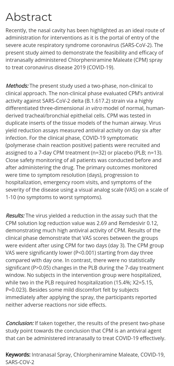 Here are the jaw dropping findings first published in the European Society of Medicine in March of 2022 showing patients who were given Chlorpheniramine Maleate resulted in a "virus reduction value" of 2.69 compared to Remdesivir which had a reduction value of only 0.12!😡