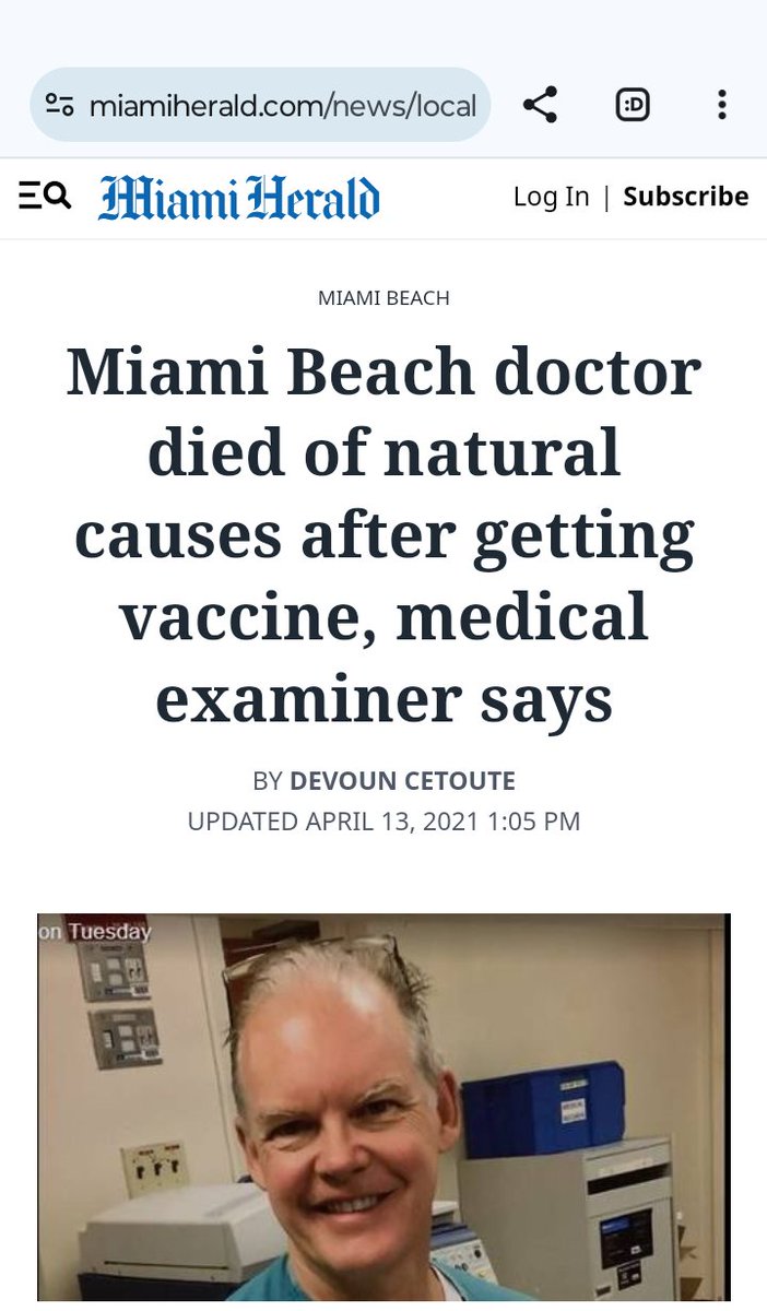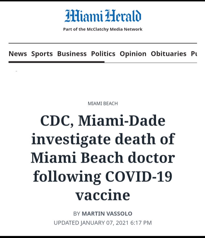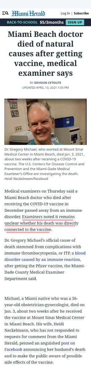 Although months later, the Miami Herald published this follow-up article with a misleading headline saying Dr. Michael died from "natural causes," the same article clearly states: "Examiners noted it remains unclear whether his death was directly connected to the vaccine."
