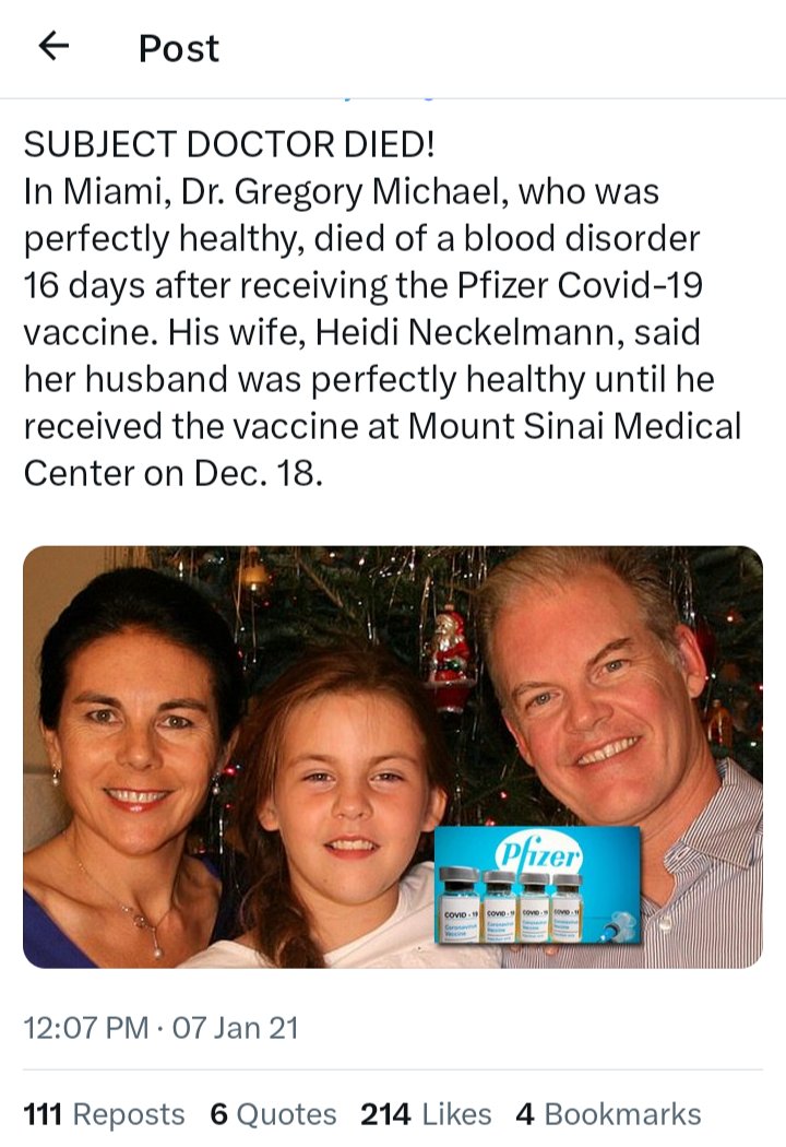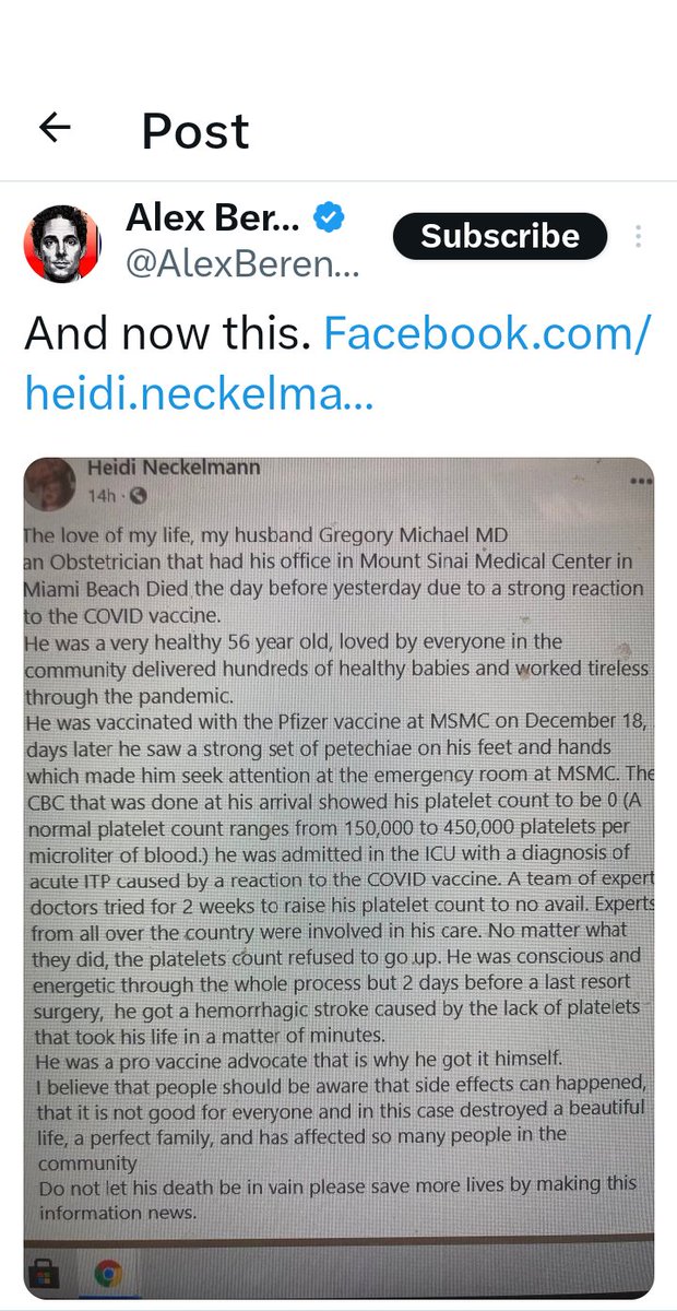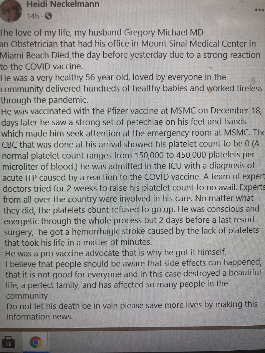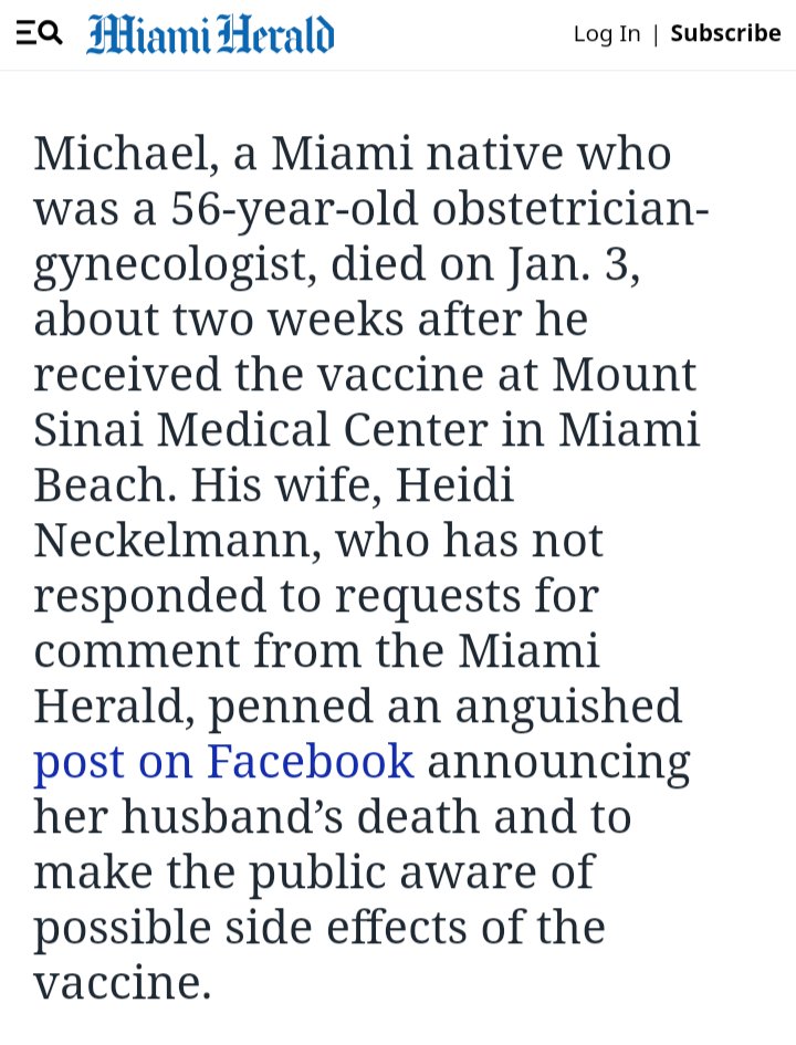And while the FB post the Miami Herald shared from Dr Michael's wife (Heidi Neckelmann) "announcing her husband’s death and to make the public aware of possible side effects of the vaccine" has been removed, thankfully Alex Berenson memorialized it in this bombshell Tweet!