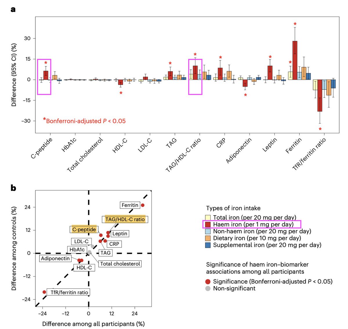 Among the most prominent metabolomic findings were that C-peptide (a marker of insulin release), and TG/HDL-C ratio were higher with more haem iron intake.