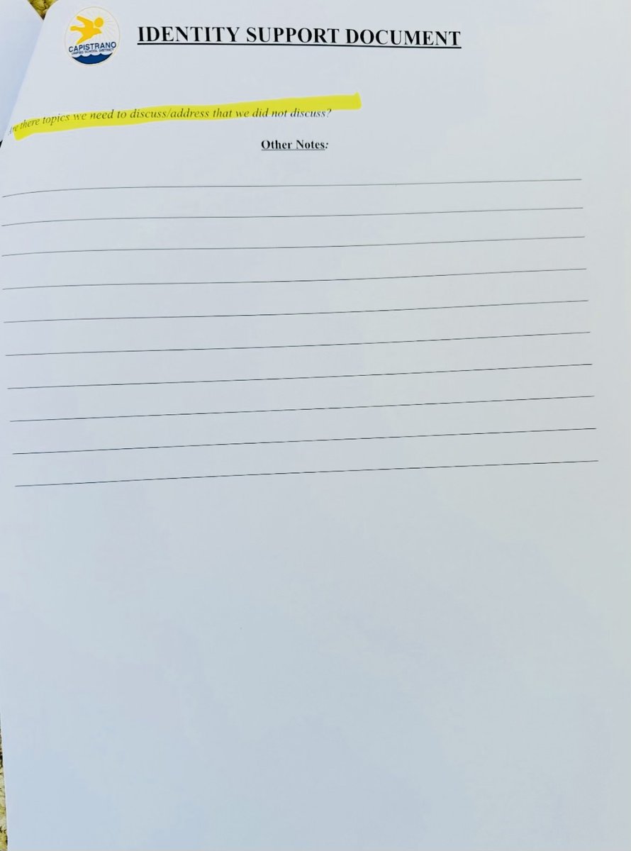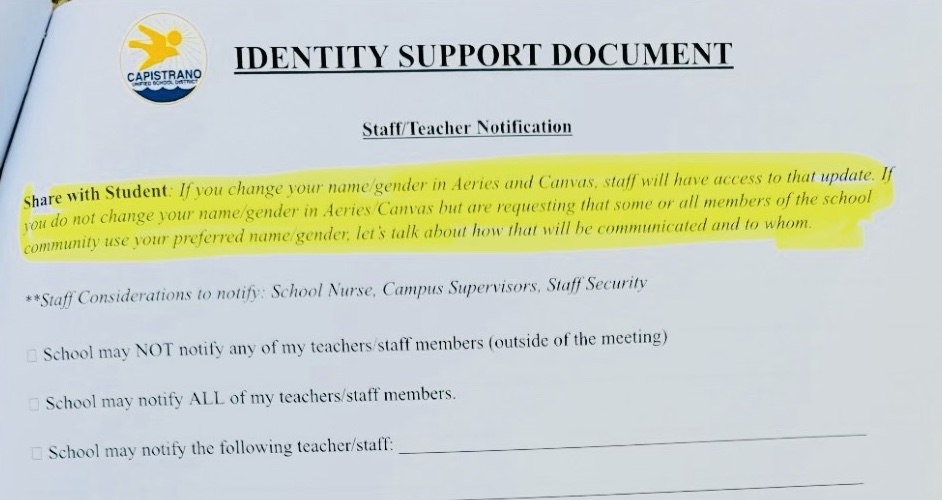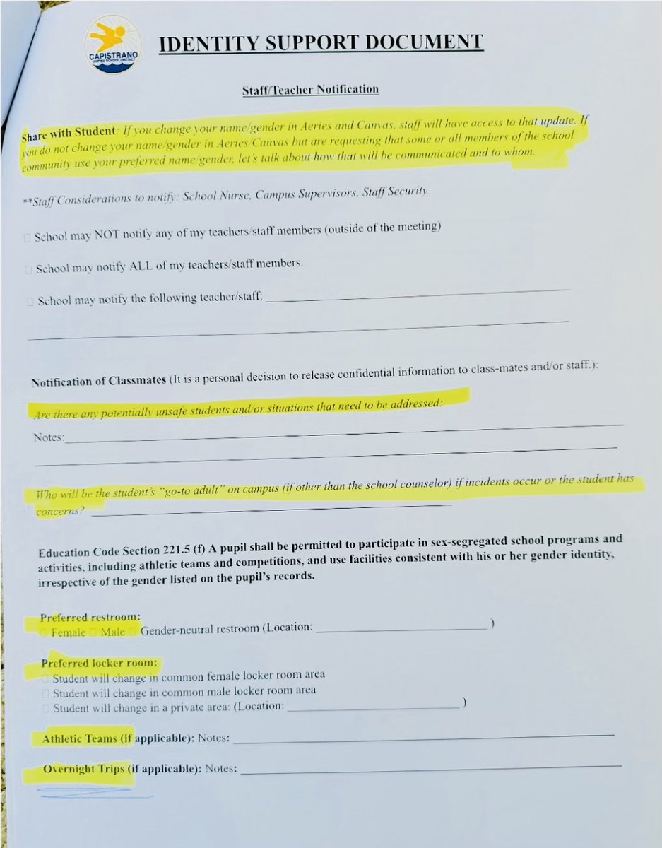 Share with student: The purpose of this document is to ensure that every student feels supported. This document will create a shared understanding about the ways your gender identity will be supported by the Capistrano Unified School District.