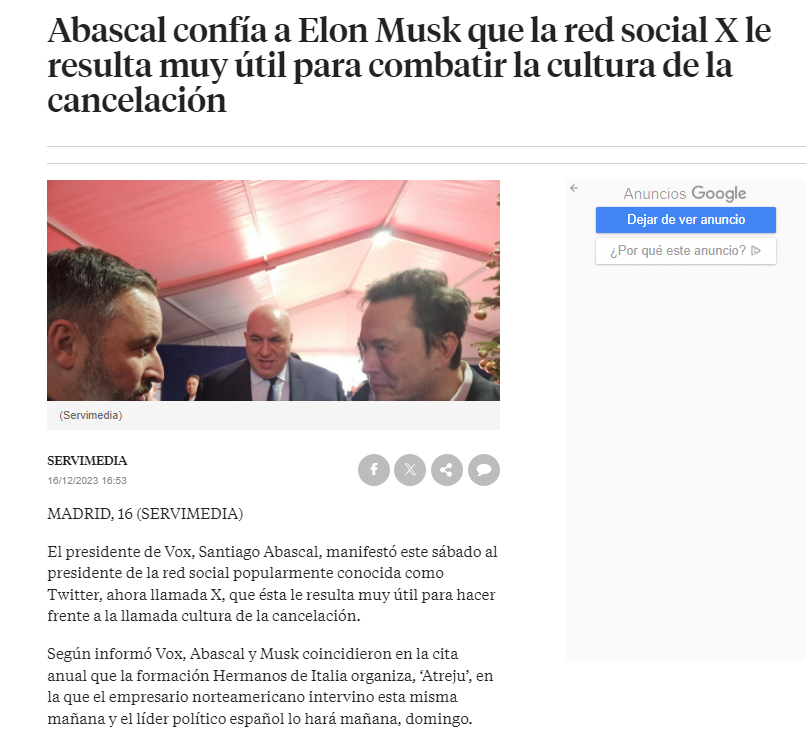A pesar de la total impunidad de estas campañas contra la democracia, la convivencia y el orden y la ley, hablan de censura, mientras aplauden con las orejas a Israel tanto VOX, Elon Musk, Milei, Corina... que si alguien critica en redes el genocidio asesina a su familia.