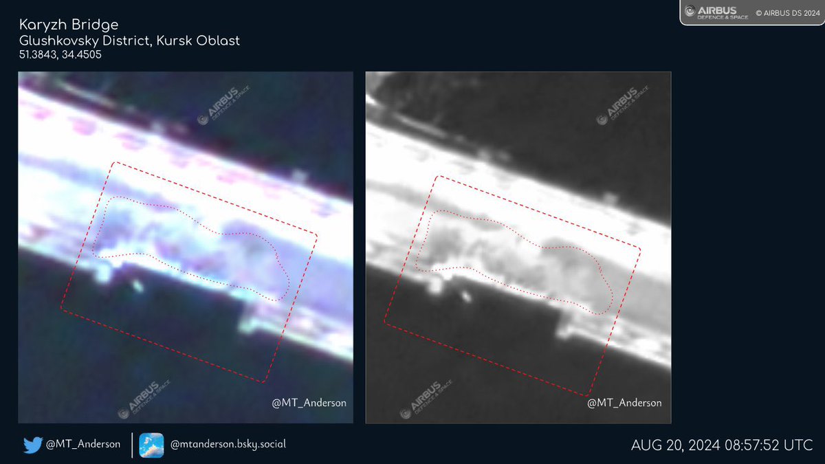 A high-resolution image shows damage to the Karyzh Bridge over the Seym River in Glushkovsky District, Kursk Oblast. The bridge is not completely destroyed, but it's questionable whether heavy equipment can safely cross it as of August 20, 2024.