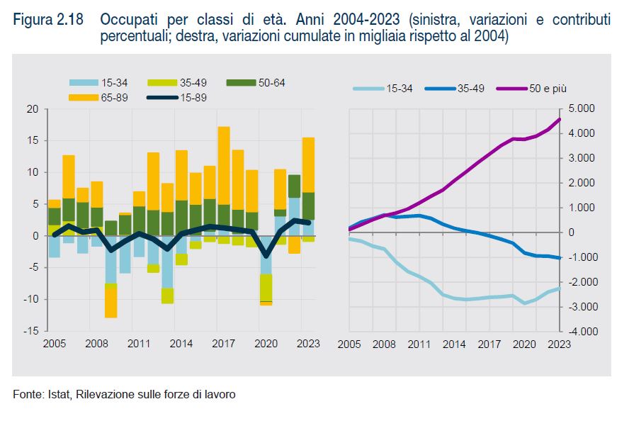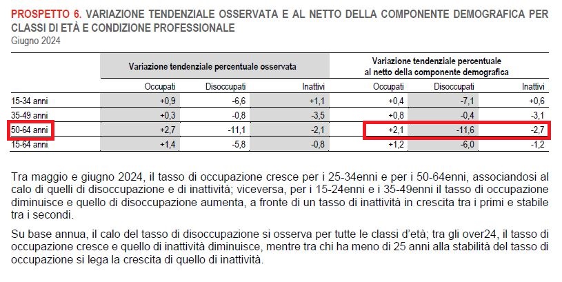 italiana. Ma vediamo di complicare il quadro e recuperiamo qualche altra informazione dall'Istat. Con i pochi dati raccolti vediamo che la crisi demografica pesa sempre di più sul mercato del lavoro, dove la componente 50-64 anni cresce sempre di più. Quindi un sistema