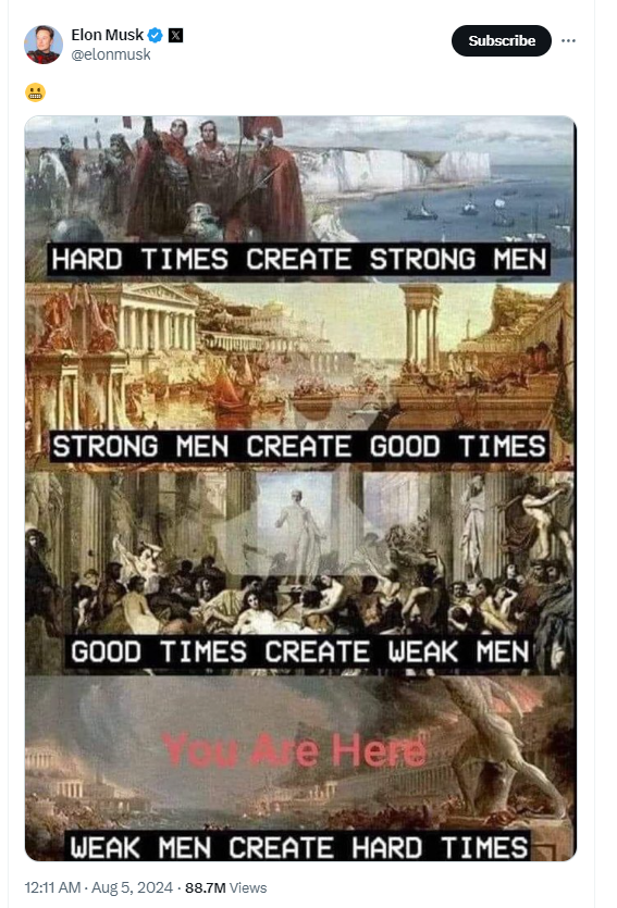 Cosa spinge uno degli uomini più ricchi della Terra ad essere ossessionato dalla futura "guerra civile in Europa", per poi passare alla caduta dell'Occidente, mentre vende il sogno di portare l'umanità su Marte? Il fatto che conduce una vita veramente malsana. Prima di